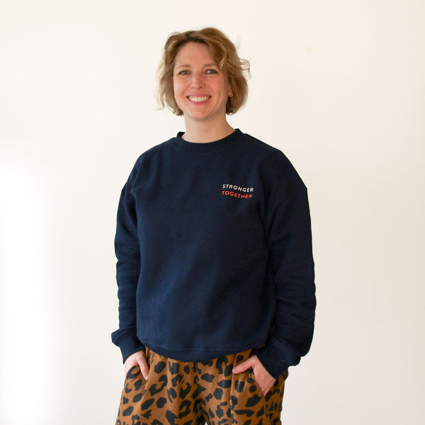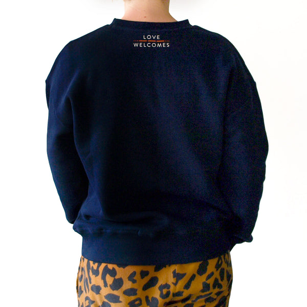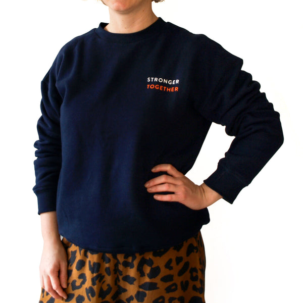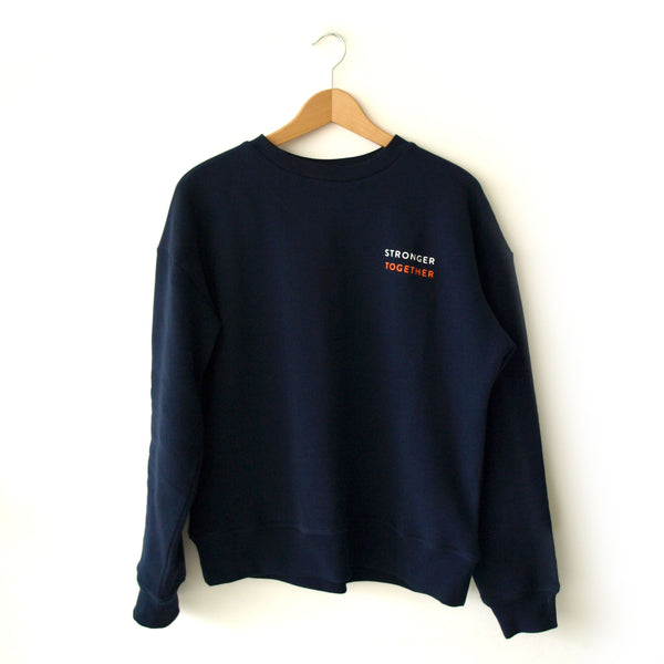 Introducing our high-quality navy brushed cotton sweatshirt. Featuring the phrase "STRONGER TOGETHER" elegantly displayed three inches long on the front left side, this sweatshirt embodies the spirit of unity. On the back, near the neck, you'll find the words "LOVE WELCOMES," also measuring three inches wide. Wear this sweatshirt with pride to showcase your commitment to collective strength and the belief that together, we can create the positive change we envision.