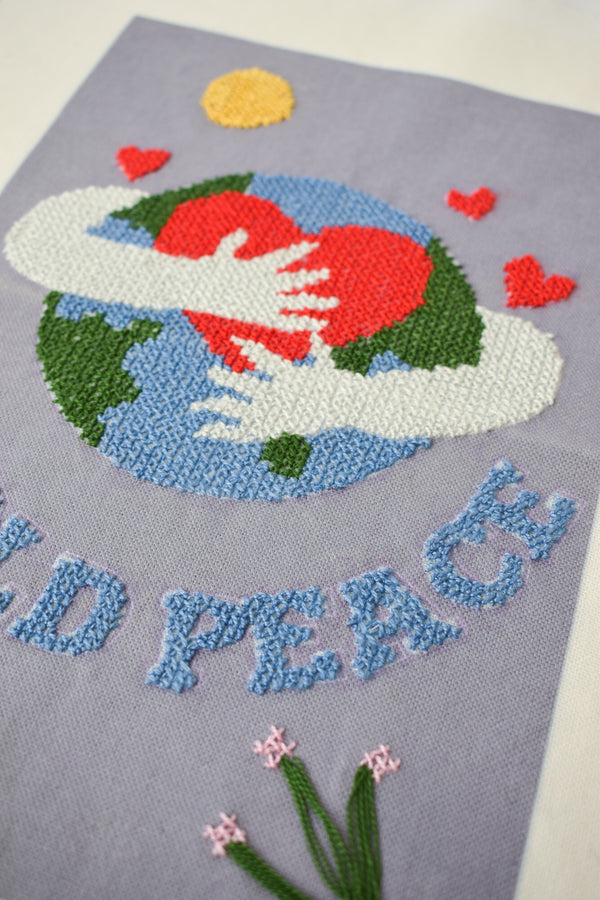 Each artist selected and printed photographs that represented “peace” to them personally. They then embroidered these images, infusing every stitch with their own meaning, stories, and dreams for a world united by kindness and care.