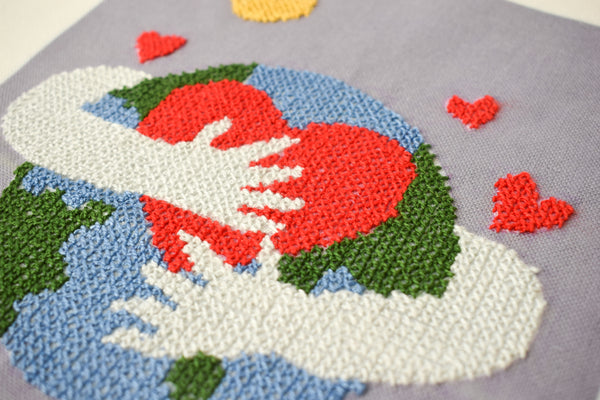 Hand-Embroidered “World Peace Heart” Art – Embracing the Globe with Love | Original & Fine Art Print Available