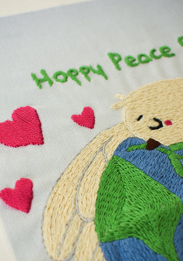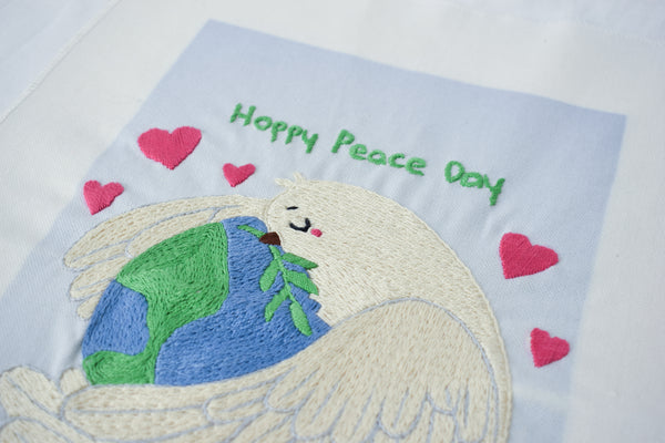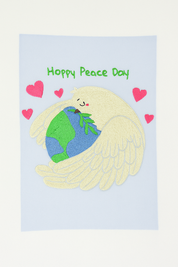 Hand-Embroidered “Happy Peace Day Dove” Art – Embracing the World with Love | Original & Fine Art Print Available