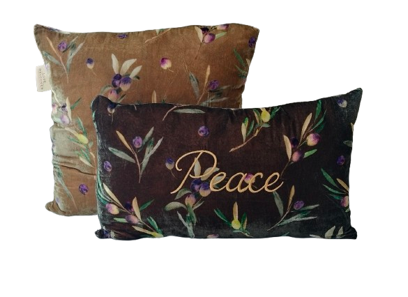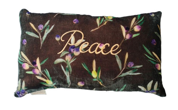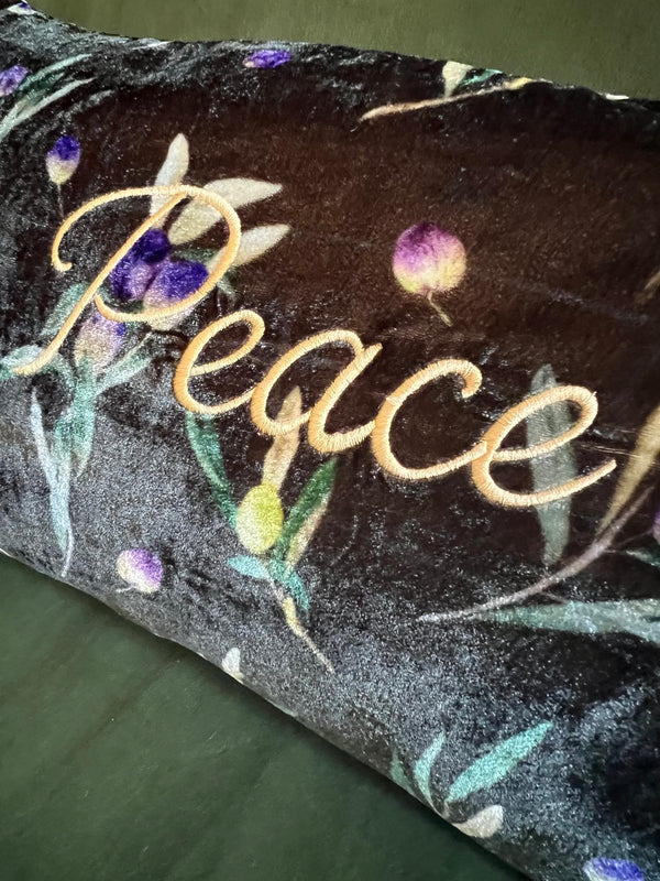 - Material: Velvet cover with embroidered “Peace” and olive branch print