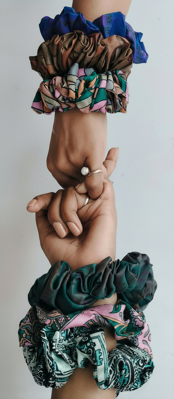 Add a vibrant, sustainable touch to your hair routine with our Upcycled Sari Scrunchie, handcrafted by women artisans at Work + Shelter. In a world where fast fashion and waste threaten our planet, choosing eco-friendly accessories can make a real difference. Each scrunchie is made from upcycled sari fabric, giving new life to beautiful, traditional textiles that might otherwise go to waste.